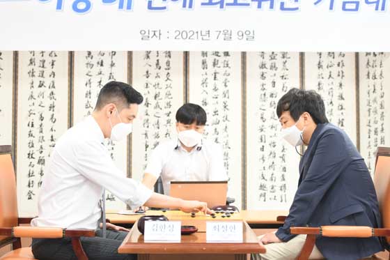 ▲김한상 이붕장학회 단장(왼쪽)과 최철한 9단의 기념 대국 장면. 최철한 9단은 1995년 열린 8회 이붕배 전국어린이바둑대회 챔피언 출신이다.