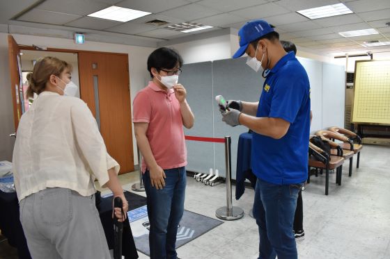▲ 입장 시 전자기기 검사 및 체온측정 후 '발열체크 완료 스티커'를 받아야한다.