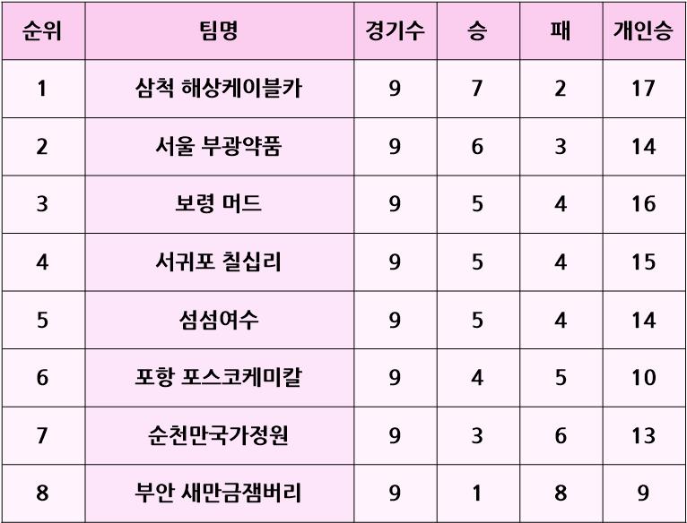 섬섬여수는 3위 보령머드(개인승수 16승), 4위 서귀포칠십리(개인승수 15승)와 5승 4패로 동률을 이뤘지만 개인승수에서 14승에 그쳐 게임차 없는 5위에 자리했다.
