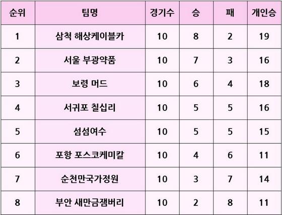 이어 5승 5패의 서귀포칠십리와 섬섬여수가 개인승수 1승 차이로 4위와 5위에 랭크됐고, 4승 6패의 포항 포스코케미칼이 6위, 3승 7패의 순천만국가정원이 7위, 2승 8패의 부안 새만금잼버리가 8위에 이름을 올렸다.