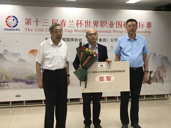 ▲준우승한 탕웨이싱 9단의 시상식 장면. 왼쪽은 중국바둑협회 린젠차오 주석. 오른쪽은 춘란그룹 쉬췬 부회장