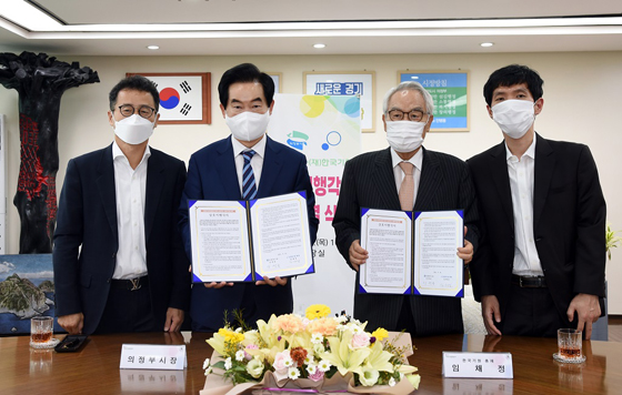 ▲상호이행각서 체결식 후 기념촬영. 왼쪽부터 양재호 사무총장, 안병용 시장, 임채정 총재, 이창호 이사