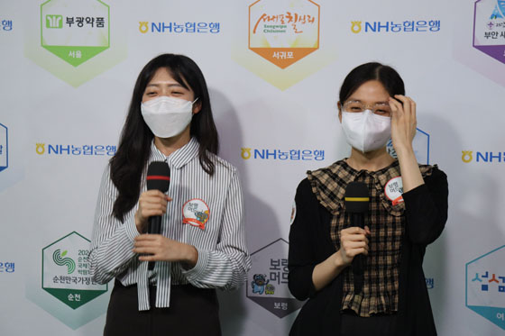 ▲챔피언결정전 진출 직후 인터뷰 중인 보령 머드 문도원 감독(왼쪽)과 김경은 2단