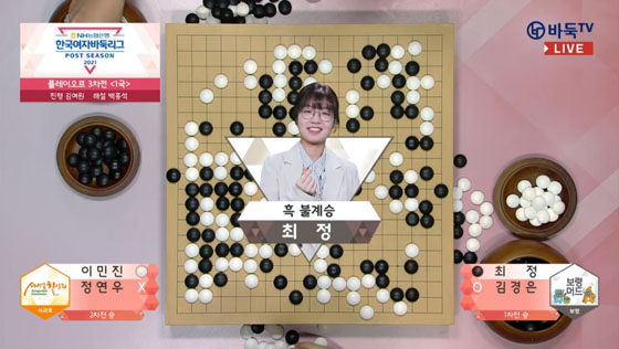 올 시즌 정규리그에서 14전 전승을 거둔 최정 9단은 포스트시즌에서도 준플레이오프 1승, 플레이오프 3승 등 4연승을 보태며 여자랭킹 1위다운 면모를 과시했다.