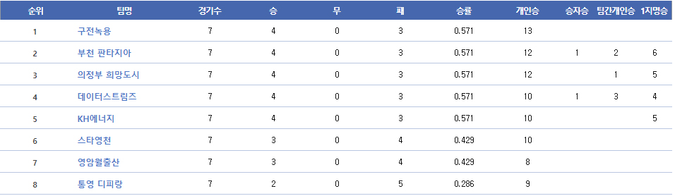 개인순위는 최규병 9단(부천 판타지아)과 차민수 6단(구전녹용)이 6승 1패로 공동 1위에 올랐고, 서봉수(KH에너지)ㆍ서능욱(의정부 희망도시)ㆍ안관욱 9단(구전녹용)이 5승 2패로 나란히 뒤를 이었다. 지난 시즌 13승 1패로 정규리그 다승왕에 올랐던 유창혁 9단(데이터스트림즈)은 전반기 4승 3패에 그치는 부진을 겪었다.