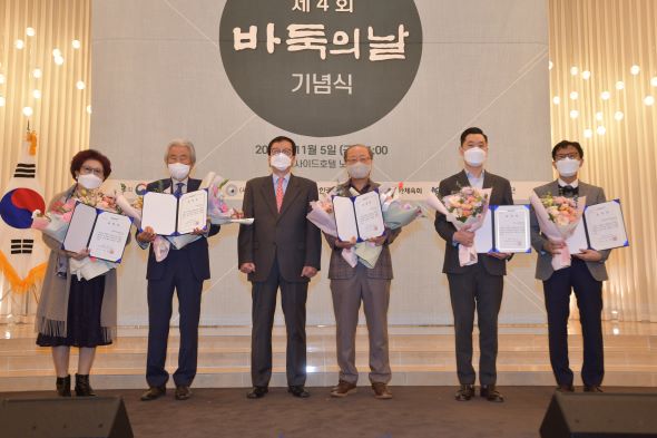 ▲국민체육진흥공단 이사장 표창, 왼쪽부터 신덕순 한국여성바둑연맹 고문, 강명주 지지옥션 회장, 최종준 대한바둑협회 수석부회장, 서효석 편강한의원 대표원장, 김한상 이붕장학회 단장, 정찬근 전(前) 광주바둑협회 부회장
