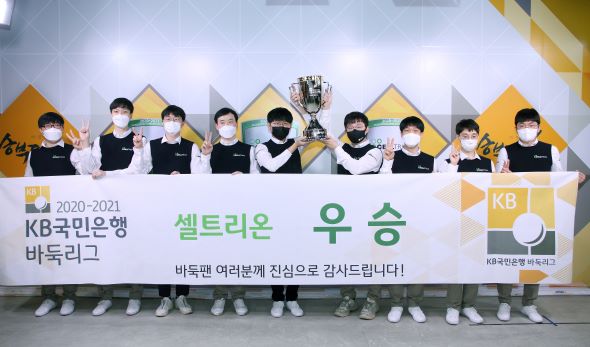 ▲2020-2021시즌 통합 우승을 차지한 셀트리온 선수단. 왼쪽부터 김희수ㆍ이태현ㆍ강승민ㆍ조한승ㆍ신진서ㆍ원성진 선수, 백대현 감독, 금지우ㆍ김성진 선수.