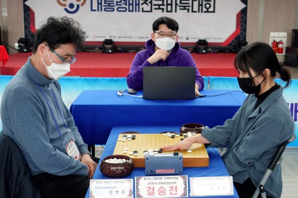 ▲ 시니어 여성 최강부 결승전, 이루비(오른쪽)가 권병훈을 반집 차로 따돌리고 우승컵을 차지했다.