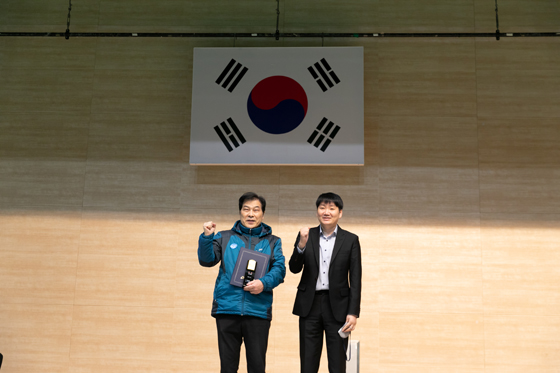 ▲남자개인부 우승자 이학용 선수(왼쪽)와 서무상 심판위원장이 시상식 후 함께 자리했다