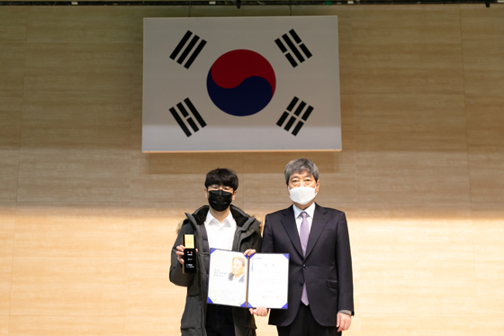 ▲신예육성 2차대회로 열린 김인국수배 신예대회 우승자 오병우 4단(왼쪽)과 한상열 한국기원 부총재
