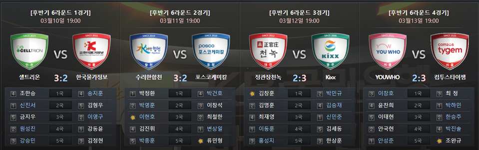 한편 10일부터 13일까지 열린 6라운드 4경기는 모두 3-2 펠레 스코어를 기록하며 후반기 치열한 순위 다툼을 이어갔다.