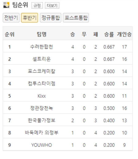 4승 2패의 수려한합천과 셀트리온이 개인승수 1승 차이로 1∼2위에 오른 가운데 3승 2패의 포스코케미칼ㆍ컴투스타이젬ㆍ킥스가 3∼5위를, 3승 3패의 정관장천녹, 2승 3패의 한국물가정보, 1승 4패의 바둑메카 의정부ㆍ유후가 6∼9위를 기록했다.