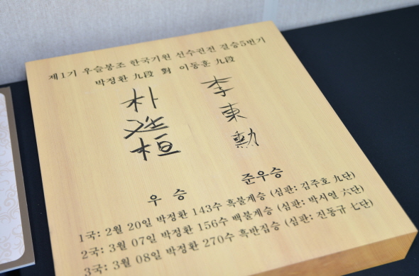 이어 수상자 박정환ㆍ이동훈 9단은 결승 기념 휘호 바둑판을 심범섭 대표에게 전달했다.