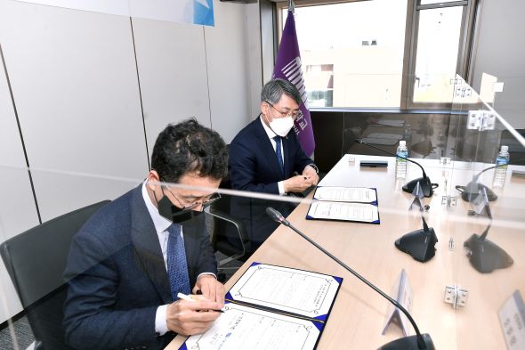 양재호 한국기원 사무총장과 서순탁 서울시립대학교 총장이 8일 서울 동대문구에 위치한 서울시립대학교 총장실에서 업무 협약을 맺었다.