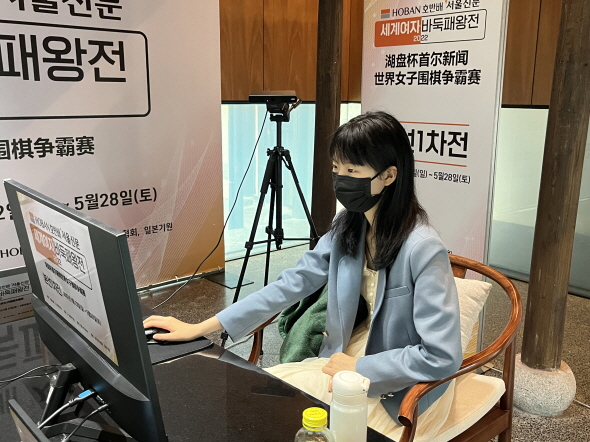 23일 서울 성동구 한서항공직업전문학교와 중국 저장(浙江)성 취저우(衢州) 국제바둑문화교류센터에서 온라인으로 열린 2022 호반배 서울신문 세계여자바둑패왕전 본선2국에서 이슬주 초단이 중국의 우이밍 3단에게 185수 만에 백 불계패를 당했다.