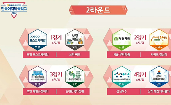 내달 2일부터 속행되는 2라운드는 포항 포스코케미칼-보령 머드(2일), 서울 부광약품-서귀포 칠십리(3일), 부안 새만금잼버리-순천만국가정원(4일), 섬섬여수-삼척 해상케이블카(5일)가 맞붙는다.