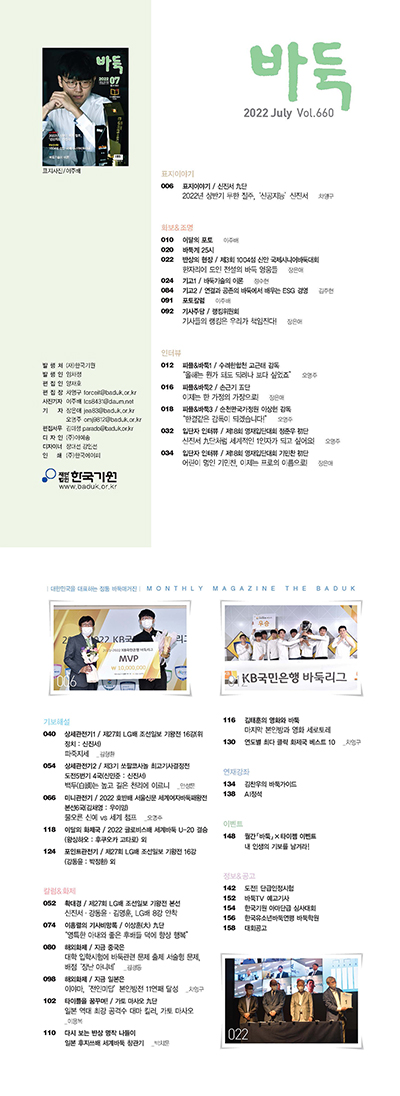 이밖에 [다시 보는 반상 명작 나들이 : 新관철동시대], 이홍렬의 [기사 비망록 : 이상훈 9단(大)] 등 다양한 칼럼과 [김찬우의 바둑가이드], [AI정석] 등 유익한 강좌물도 함께 수록됐다.
