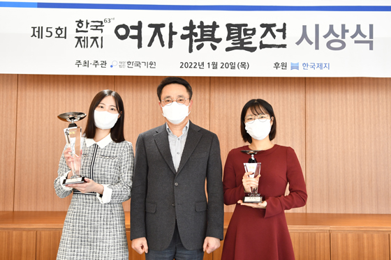 ▲5회 한국제지 여자기성전 시상식. 왼쪽부터 오유진 9단, 안재호 한국제지 대표이사, 최정 9단 [자료사진]