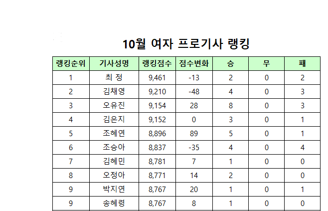 여자기사 중에서는 최정 9단이 6계단 하락한 30위, 김채영 7단이 8계단 하락한 75위를 기록했다. 오청원배 우승으로 6년 만에 세계 챔프에 오른 오유진 9단은 7계단 상승한 91위에 랭크됐다. 여자랭킹 3위에 올랐던 김은지 3단은 두 계단 하락한 92위를 기록하며 4위로 내려왔다.
