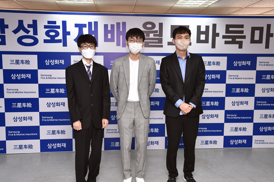 ▲16강 둘째 날 경기에 출전한 한국 선수들. 왼쪽부터 이형진 6단, 신진서 9단, 박정환 9단