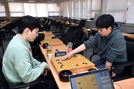 ▲강동윤 9단(오른쪽)은 하나은행22-23 MZ 바둑 슈퍼매치 예선에서 김정현 8단을 누르고 프로통산 1천승을 기록했다.