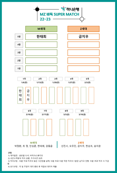 ▲‘22-23 하나은행 MZ바둑 슈퍼매치’ 본선 대진표. 5명 연승대항전으로 우승을 가린다.