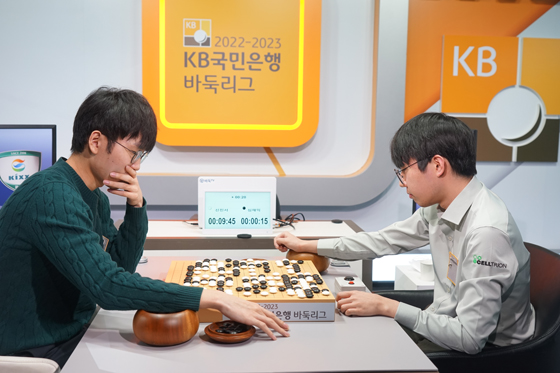 ▲신진서 9단(왼쪽)이 심재익 6단에게 승리했지만 소속팀 킥스는 셀트리온에 1-3으로 패했다.