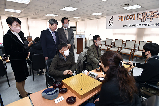 감동과 추억이 넘치는 시니어들의 축제, 대주배가 열 번째 대회 시작을 알리는 개막식을 갖고 본격적인 레이스에 돌입했다. 17일 서울 성동구 한국기원에서 열린 제10기 대주배 남녀 프로시니어 최강자전 개막식에는 대회 후원사인 TM마린 김대욱 사장과 한국기원 한상열 부총재, 양재호 사무총장, 양상국 9단 그리고 K바둑 김효정 이사, 프로기사협회 한종진 회장, 한국여성바둑연맹 이광순 회장 등이 참석해 개막을 축하했다.