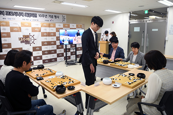 ▲ 신진서 9단(가운데)가 대주배 10주년을 축하하며 '신진서 사랑회' 회원들과 수담을 나눴다.