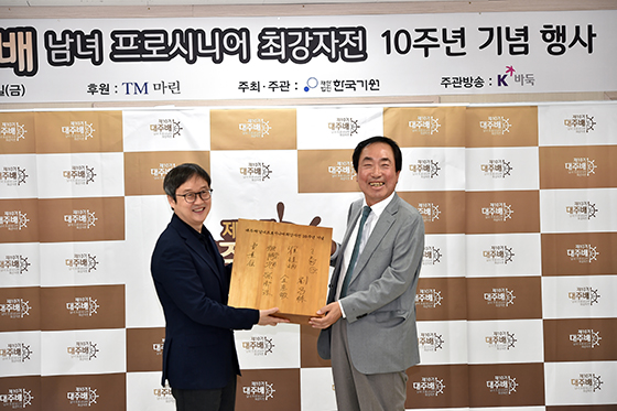 ▲ 열 번째 대회 우승자 유창혁 9단(왼쪽)이 역대 우승자들의 사인이 담긴 바둑판을 김대욱 TM마린 대표께 전달했다.