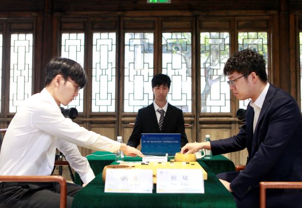 ▲신진서 9단(왼쪽)은 중국 탄샤오 9단에게 승리하며 결승에 올랐다.