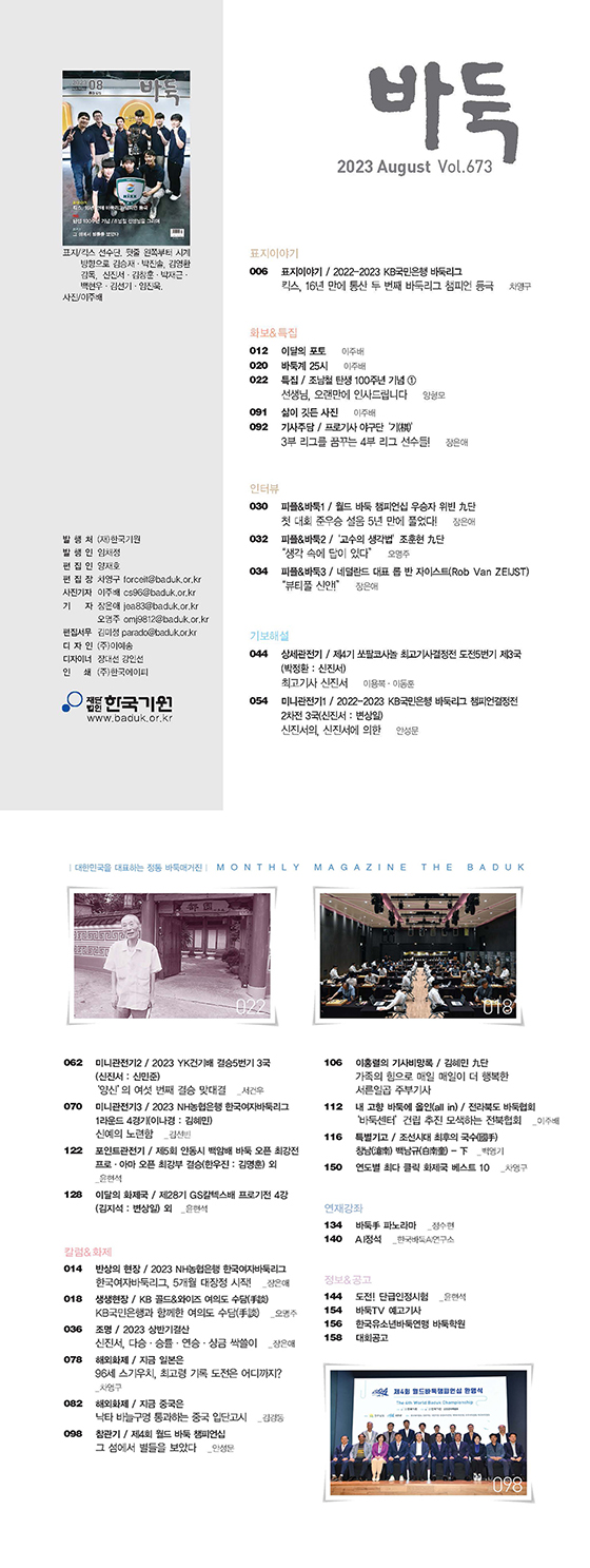 8월호 표지는 16년 만에 KB국민은행 바둑리그에서 우승한 킥스(Kixx) 선수단이 장식했다. 포스트시즌에서 ‘신진서 효과’를 톡톡히 보며 정상에 오른 킥스의 드라마 같은 우승 스토리와 감독 부임 후 첫 우승컵을 안은 김영환 감독의 이야기를 [표지이야기]에서 다뤘다.