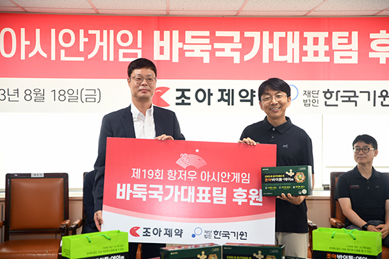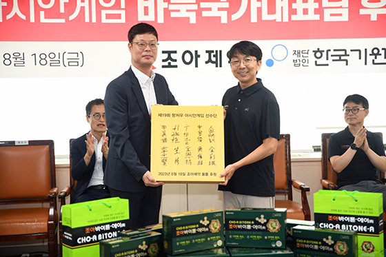 조성배 조아제약 대표는 바둑 국가대표 선수단의 선전을 기원하며 기억력 개선과 지구력에 도움이 되는 건강기능식품 ‘조아바이톤-에이(A)’를 전달했다.