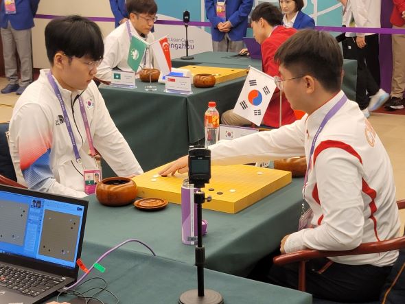 ▲아시안게임 데뷔전 첫 대국을 승리로 장식한 신진서 9단(왼쪽).