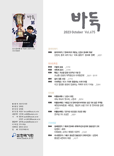 “마지막 결승이라고 생각하고 최선을 다해 임하겠다”는 포부를 밝혔던 신진서 9단이 중국 셰커 9단을 꺾고 14년 만에 응씨배 우승컵을 한국에 되찾아왔다. 첫 출전에 우승까지 일궈낸 신진서 9단의 이야기와 중국 현지의 뜨거운 열기까지 [표지이야기]에서 생생히 담아냈다.