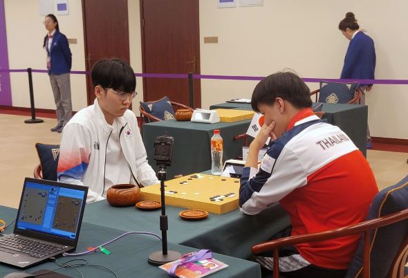 ▲남자개인전 6라운드 신진서(왼쪽)vs위치리치.