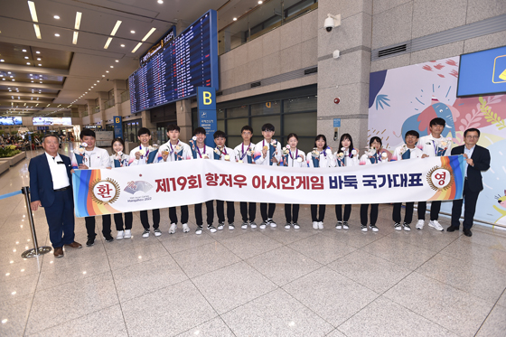 ▲항저우 아시안게임에서 3개의 메달을 거머쥔 한국 선수단이 인천공항에 도착해 기념촬영을 가졌다. 박정채 한국기원 이사(왼쪽)와 양재호 한국기원 사무총장도 함께 자리했다.