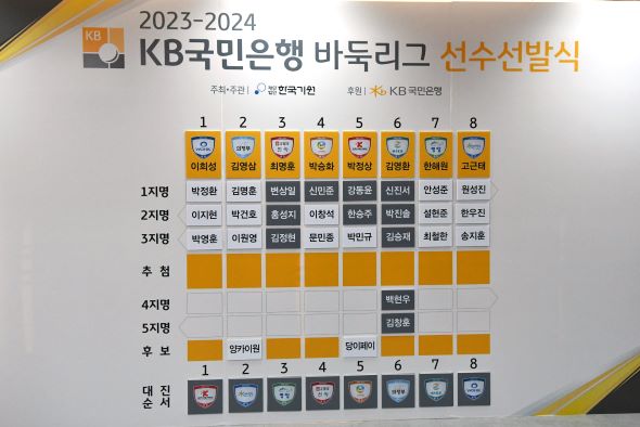 선발식에는 GS칼텍스(Kixxㆍ김영환 감독)를 비롯해 KGC인삼공사(정관장천녹ㆍ최명훈 감독), 한국물가정보(한국물가정보ㆍ박정상 감독), 합천군(수려한합천ㆍ고근태 감독), 의정부시(바둑메카 의정부ㆍ김영삼 감독), 울산 고려아연(울산 고려아연ㆍ박승화 감독), 원익(원익ㆍ이희성 감독)과 신규팀 영암군(마한의 심장 영암ㆍ한해원 감독) 등 총 8개 팀 감독과 관계자들이 참석했다.