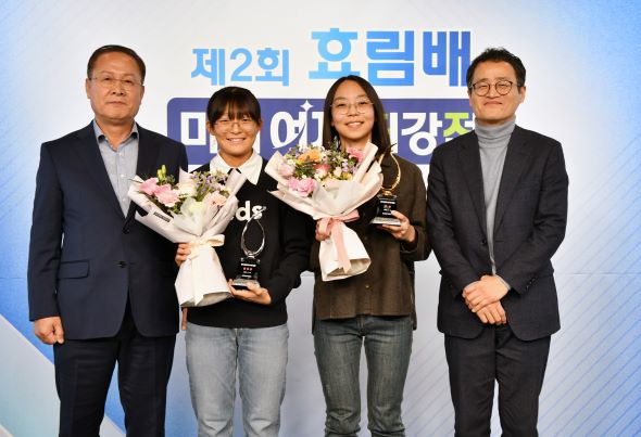 ▲시상식 기념촬영. 왼쪽부터 김수년 대표이사, 준우승 김주아, 우승 박소율, 양재호 사무총장.