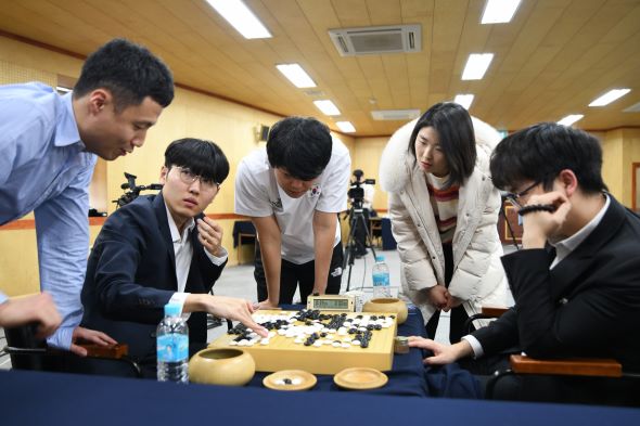 ▲신진서 9단과 커제 9단의 국후 복기에 이영구 9단과 홍민표ㆍ오정아 코치가 함께했다.