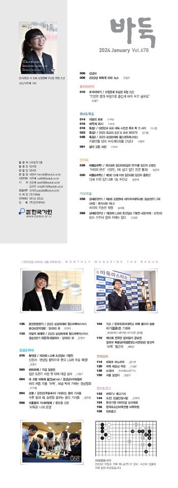 신년호 표지는 제6회 오청원배를 정복하고 돌아온 바둑 여제 최정 9단이 장식했다. 최정 9단은 오청원배 통산 세 번째 우승에 성공하며 센코컵 우승과 더불어 2023년 세계 여자바둑대회 2관왕에 올랐다. 10년째 여자랭킹 1위 자리를 지키고 있는 최정 9단의 2024년 새해 목표는 무엇일까. 최정 9단과의 일문일답은 [표지이야기]에서 확인할 수 있다.