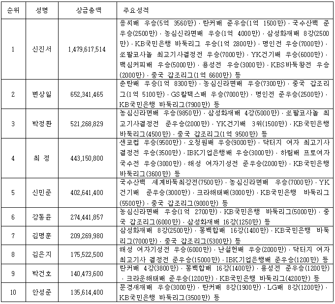 9회 국수산맥 국제바둑대회 세계바둑최강전 우승자 신민준 9단이 4억 260만 원으로 5위를 차지했고, 강동윤 9단이 2억 7440만 원으로 6위에 자리했다. 7위에 오른 김명훈 9단이 2억 930만 원으로 첫 2억 원을 돌파했고, 해성 여자기성전의 새로운 주인공 김은지 9단이 1억 7550만 원으로 8위에 랭크돼 첫 상금 톱10에 포함됐다. 9위는 1억 4070만 원의 박건호 8단이 차지했고, 1억 3560만 원을 벌어들인 안성준 9단이 10위에 올랐다.