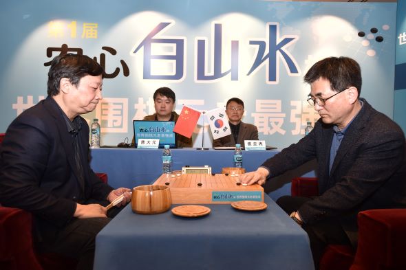 ▲농심백산수배에서도 최규병 9단(오른쪽)이 중국 차오다위안 9단에게 승리하며 한국은 하루 2승을 수확했다.