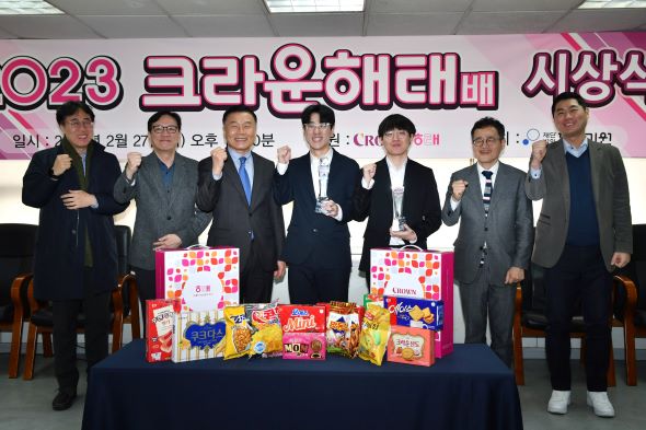 27일 한국기원 대회장에서 ‘2023 크라운해태배’ 우승자 박건호 9단과 준우승자 설현준 8단에 대한 시상식이 열렸다. 시상식에는 후원사를 대표해 참석한 기종표 크라운해태홀딩스 상무와 양재호 한국기원 사무총장, 한종진 프로기사협회장 등이 자리해 수상한 선수들을 축하했다.