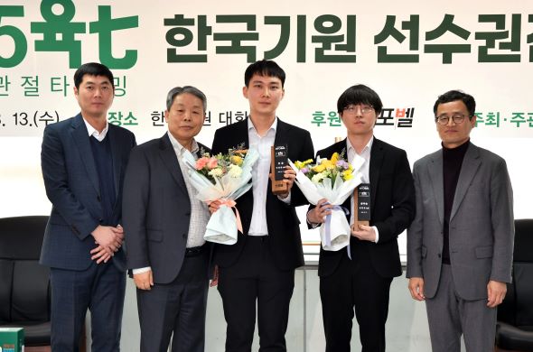 ▲시상식 기념사진. 왼쪽부터 한종진 기사회장, 심범섭 인포벨 회장, 박정환 9단, 설현준 9단, 양재호 사무총장.