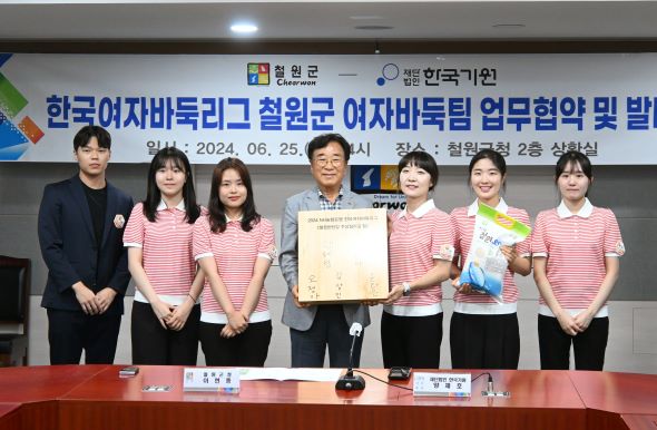 ▲철원한탄강 주상절리길 팀 사인 기념반 전달. 왼쪽부터 송지훈 코치, 윤라은ㆍ김상인 선수, 이현종 철원군수, 김혜림 감독, 오정아ㆍ조승아 선수.
