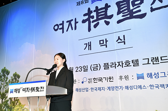 전기 대회 우승자로 무대에 오른 김은지 9단은 “지난해 여자기성전에서 우승했던 순간은 바둑을 시작한 이후 가장 기쁜 날이었다. 꿈을 이룰 수 있게 멋진 대회를 만들어준 해성에 감사드린다”고 말했다. 이어 “지금부터 해성 여자기성전의 여덟 번째 대회를 시작한다”면서 대회 개회를 선언했다.