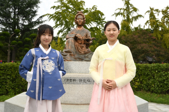 ▲준우승 허서현 4단, 우승 김은지 9단(오른쪽) 허난설헌 동상 앞에서 기념사진
