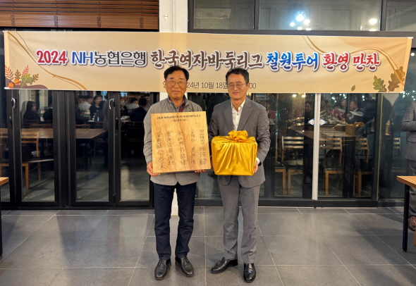 ▲환영 만찬식에서 기념 선물을 교환한 이현종 철원군수와 양재호 한국기원 사무총장(오른쪽).