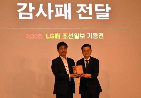 ▲30주년 감사패 전달식. 양재호 한국기원 사무총장(오른쪽)이 박은호 조선일보사 문화사업단장에게 감사패를 전달했다.